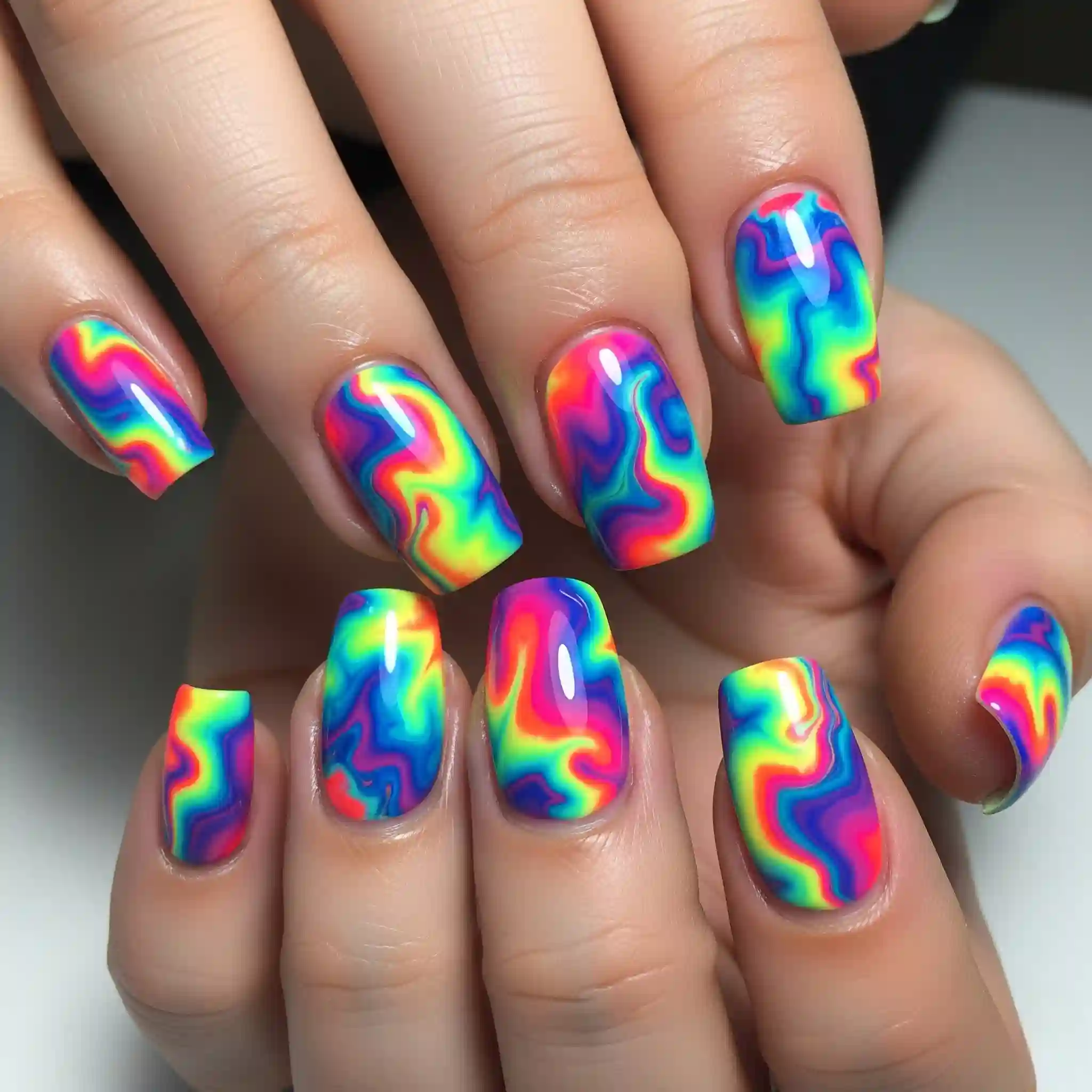 Dive into a mesmerizing swirl of neon pinks, electric blues, and sunny yellows that blend and flow like liquid energy. This abstract style is unique on every nail and guaranteed to turn heads.