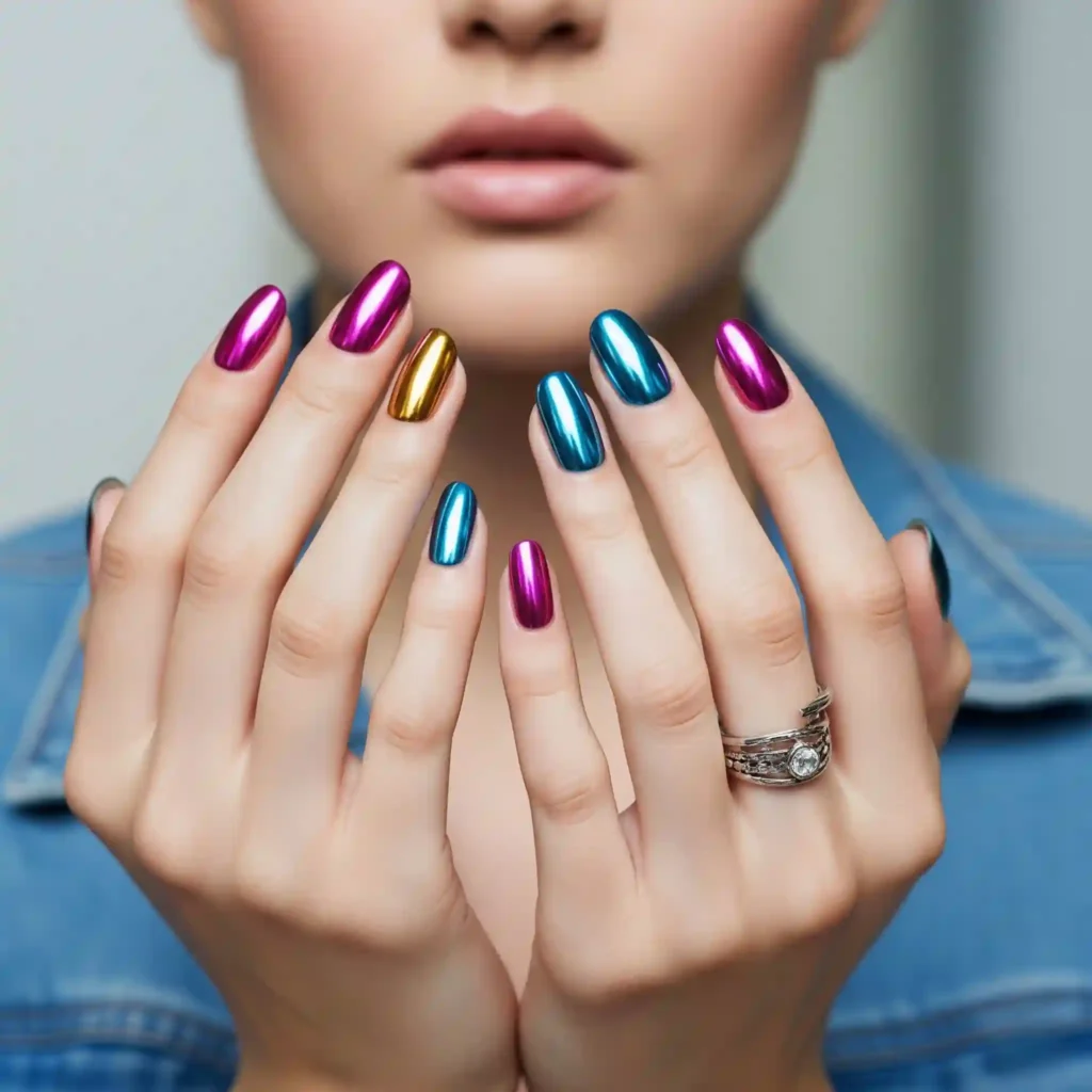 The mirror-like finish of chrome nails isn’t going anywhere. Experiment with different chrome colors beyond the classic silver and gold, like vibrant pinks and blues.