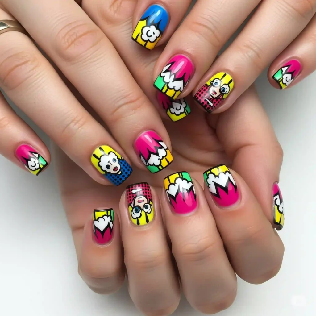 Embrace bold outlines, cartoonish motifs, and vibrant primary colors for a fun and playful look inspired by comic books and pop culture.