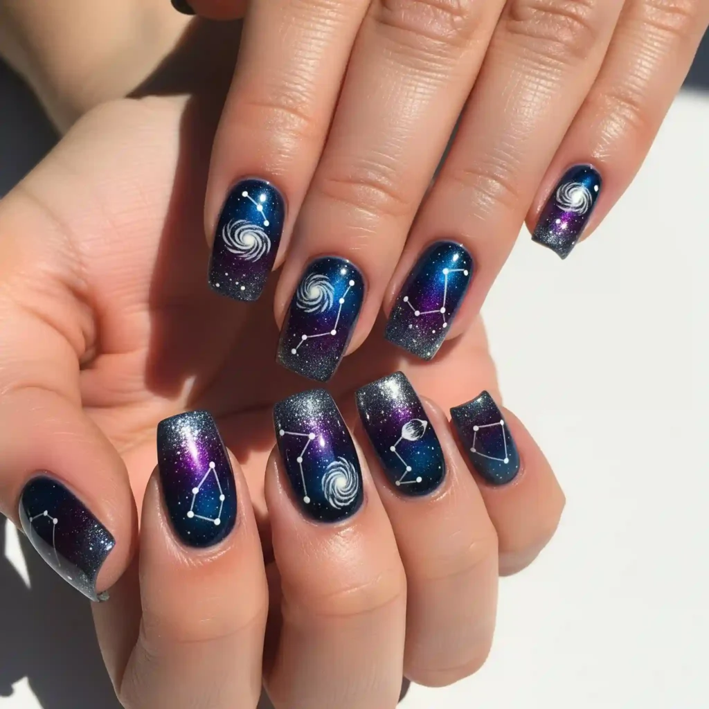 Take your nails on an interstellar journey with deep blues and purples speckled with shimmering silver and hints of cosmic dust. Tiny painted galaxies and constellations add an extra touch of magic.