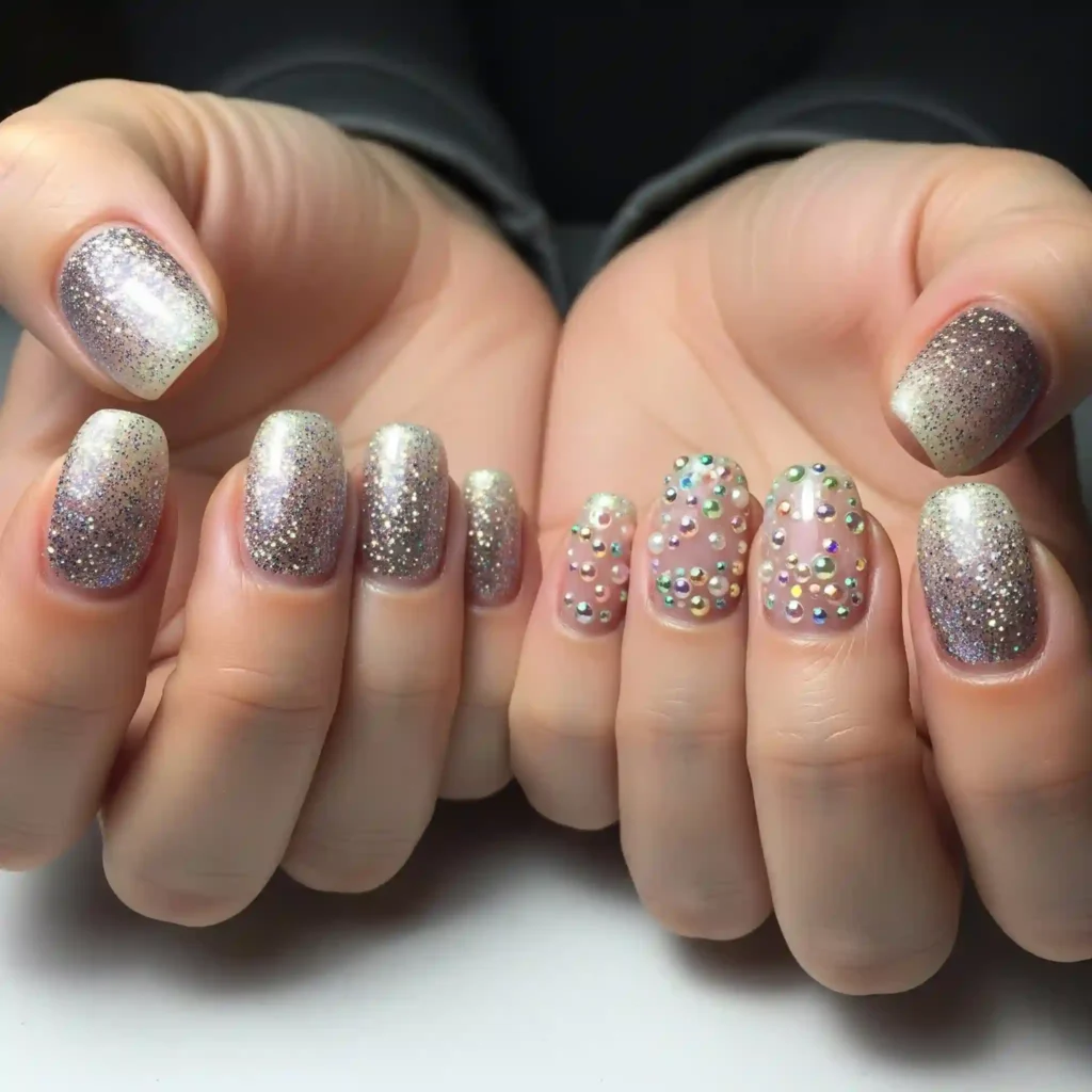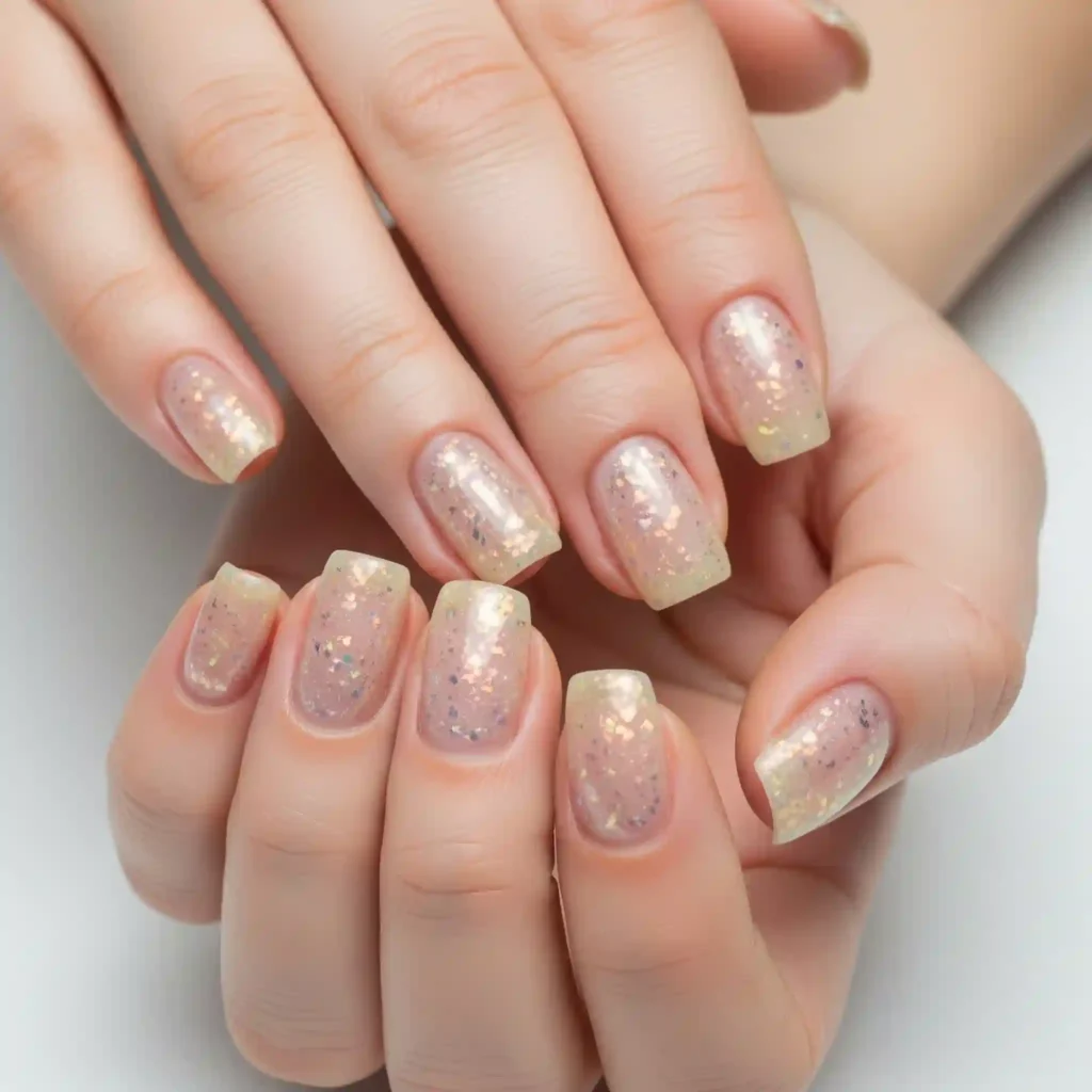 For a more understated yet glamorous look, opt for sheer nude or pastel bases infused with delicate iridescent shimmer that catches the light beautifully.